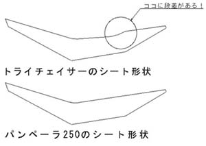 125 or 200 ? さてさて、トライチェイサーを作ることに強い決意と、並々ならぬ熱意を発揮しようとしている健一郎でありますが、ここに来てちょっと微妙なことに気がつきました。ベースのマシンはパンペーラ250だとばかり思っていましたが、トライチェイサーの写真と見比べて、どうにも何かが引っかかる。ネットや雑誌で見ていたパンペーラの写真は250cc。はてさて何であろうか?この違和感は?何度となく見比べてその微妙な違和感に気がつきました。 シートの形状が違うのである!